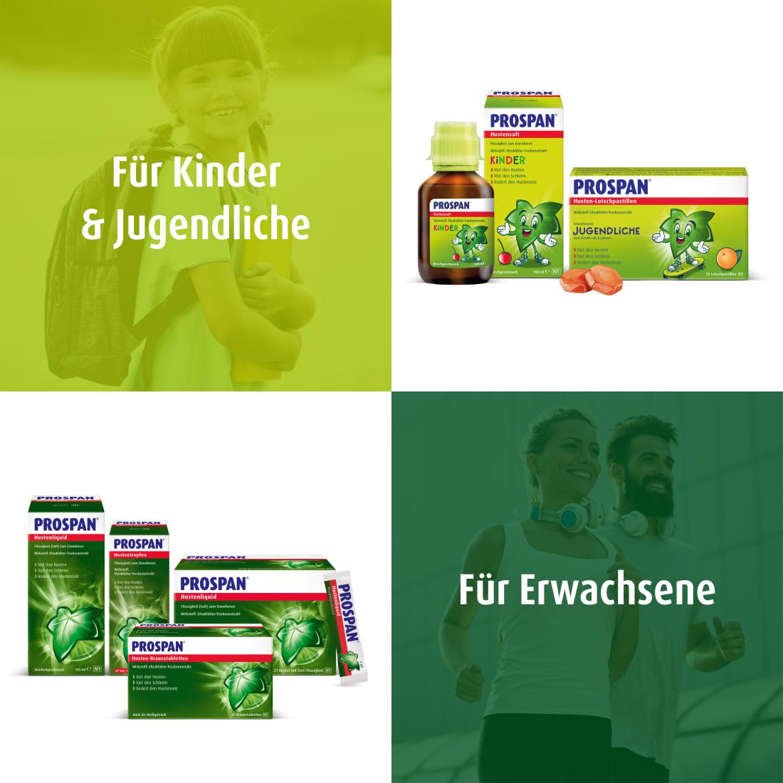 - PROSPAN®. SANFT FÜR KINDER. STARK GEGEN HUSTEN: Prospan® Hustensaft mit dem einzigartigen Efeu-Spezial-Extrakt EA 575® befreit von Husten und Bronchitis, indem er den Hustenreiz lindert, festsitzenden Schleim löst, die Bronchien erweitert und die Entzündung lindert – damit Ihr Kind schnell wieder gesund werden kann.