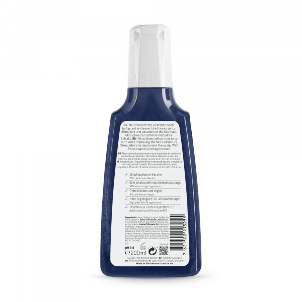 Das Silberglanz-Shampoo mit Salbei neutralisiert einen unschönen Gelbstich nachhaltig. Es ist mit violetten Pigmenten versehen, die dem Haar einen kühlen, natürlichen Farbton verleihen. Und das ohne negative Begleiterscheinungen: Naturbasierte Tenside reinigen die Haare ganz schonend und mild, die Kopfhaut wird stimuliert. Die RAUSCH Expertinnen in Kreuzlingen am Bodensee haben das lila Shampoo zudem mit pflanzlichem Keratin angereichert. Dieser glättet das Haar von innen heraus und stärkt so die Haarstruktur. Als weiteres Plus ist das Shampoo ganz schön ergiebig: Eine Flasche reicht je nach Haarlänge für 30 – 45 Anwendungen.