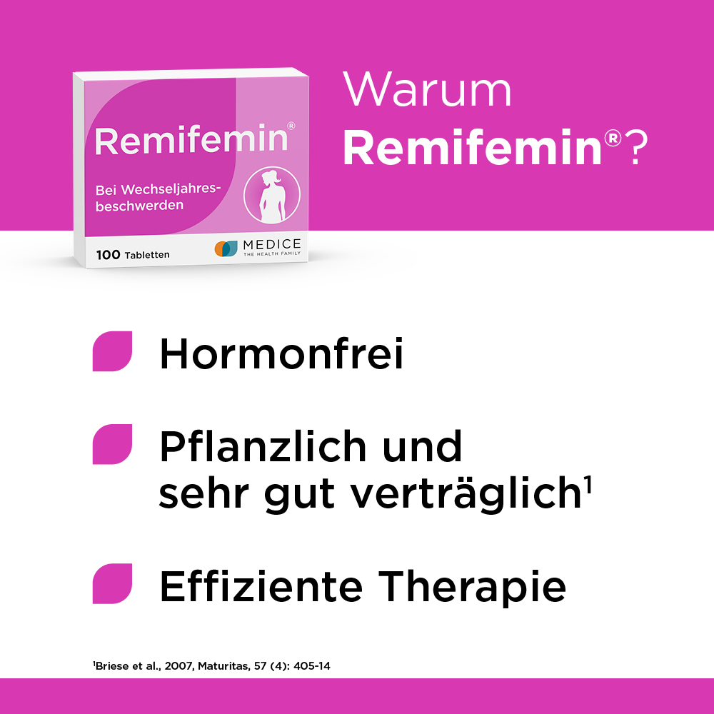 Auch im weiteren Verlauf der Wechseljahre, wenn die Beschwerden weitestgehend unter Kontrolle sind bzw. wieder abklingen, ist das sanfte und zuverlässige Remifemin die richtige Lösung.