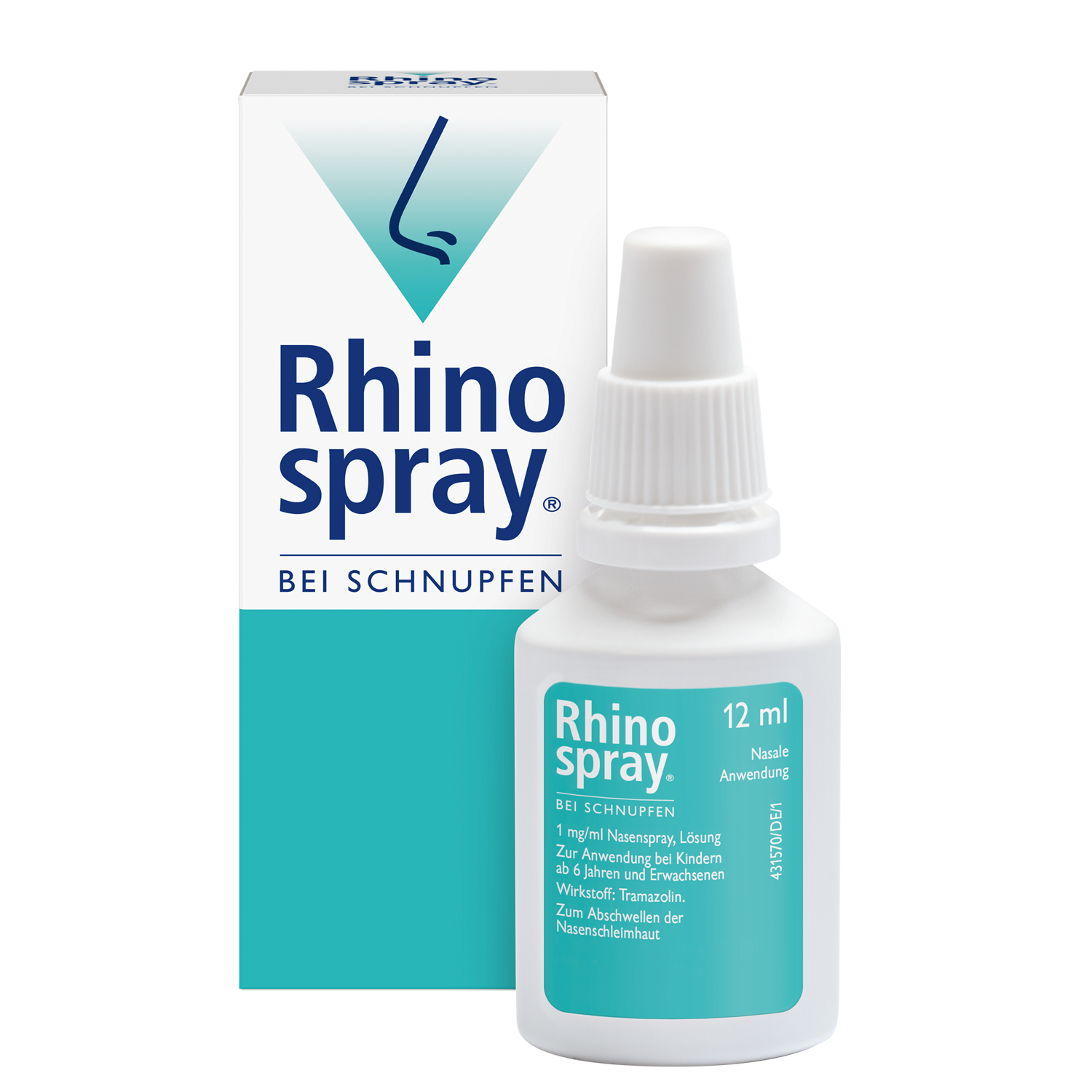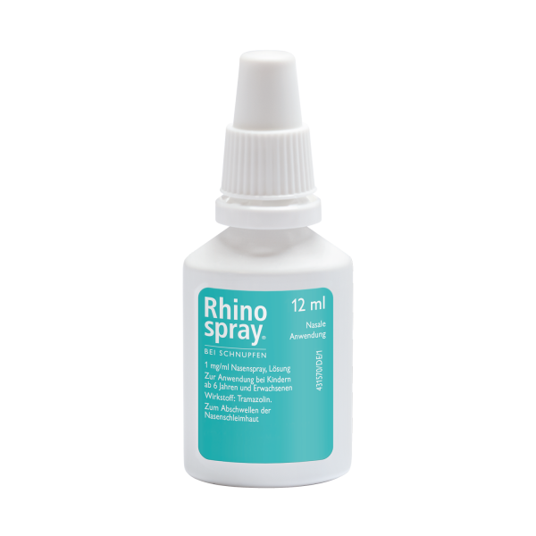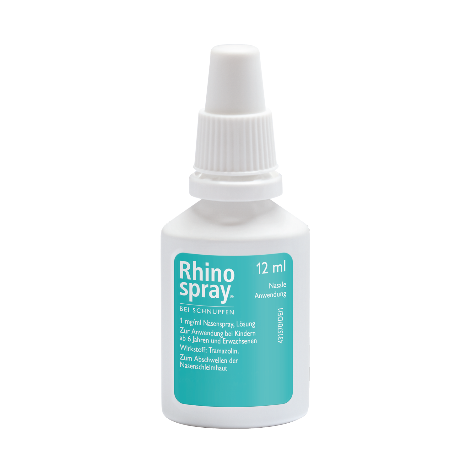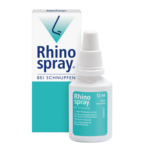 Rhinospray® bei Schnupfen. Wirkstoff: Tramazolinhydrochlorid. Anw.-geb.: Zum Abschwellen der Nasenschleimhaut bei Schnupfen, bei anfallsweise auftretendem Fließschnupfen (Rhinitis vasomotorica) sowie bei allergischem Schnupfen (Rhinitis allergica) und zur Erleichterung des Sekretabflusses bei Nasennebenhöhlenentzündungen sowie bei Tubenkatarrh (Verschluss der Ohrtrompete durch Schleimhautschwellung) in Verbindung mit Schnupfen. Warnhinweis: Enthält Benzalkoniumchlorid. Apothekenpflichtig.