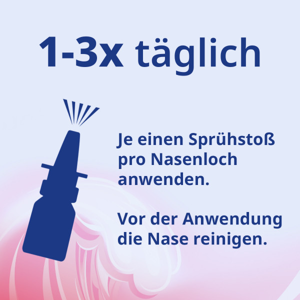 Sprühen Sie das Arzneimittel in das/jedes Nasenloch ein. Während des Einsprühens atmen Sie leicht durch die Nase. Zuvor reinigen Sie die Nase durch kräftiges Schnäuzen. Vor der ersten Anwendung sollten Sie mehrmals pumpen bis ein Sprühnebel entsteht. Um Infektionen zu vermeiden, sollte das Arzneimittel immer nur von einem Patienten benutzt werden.