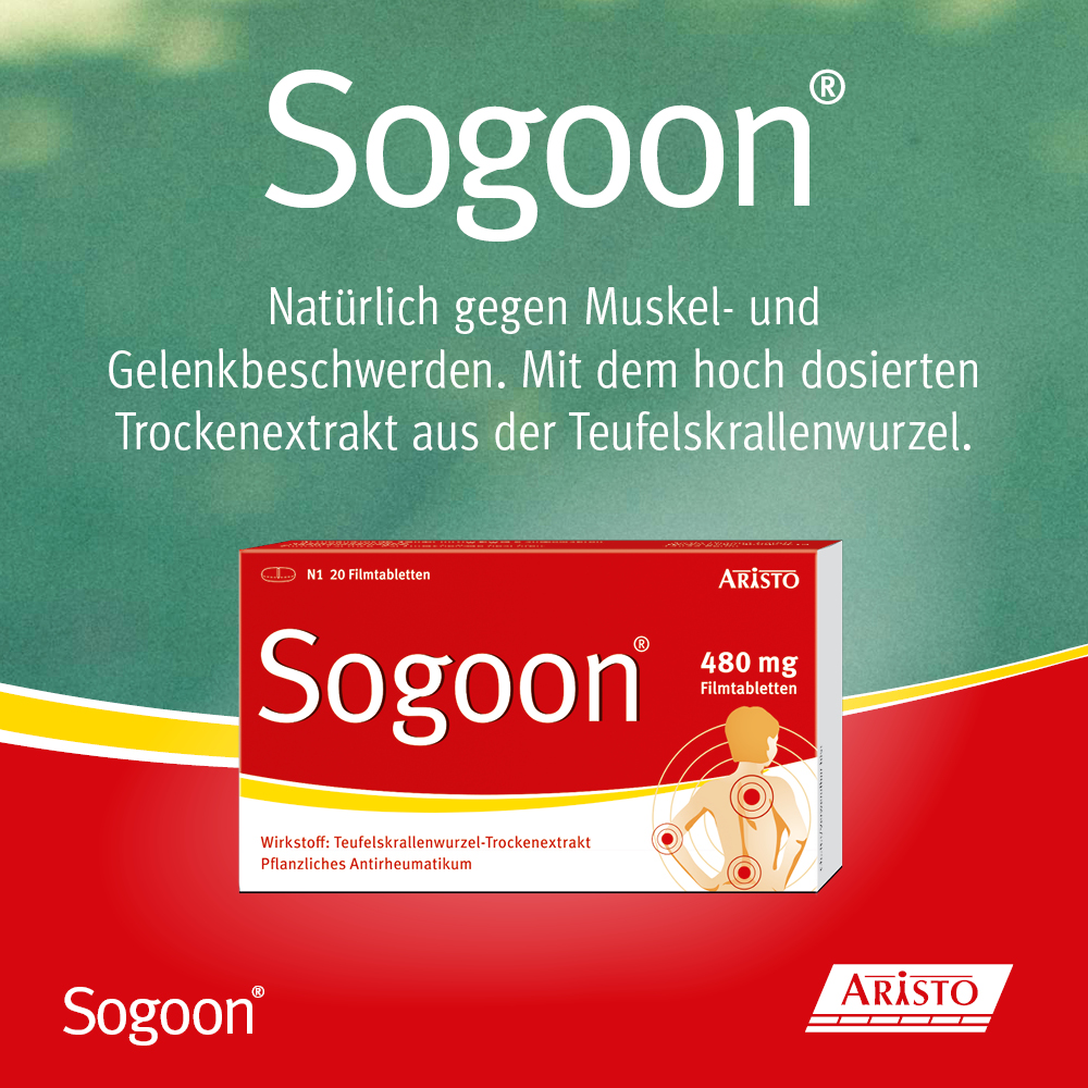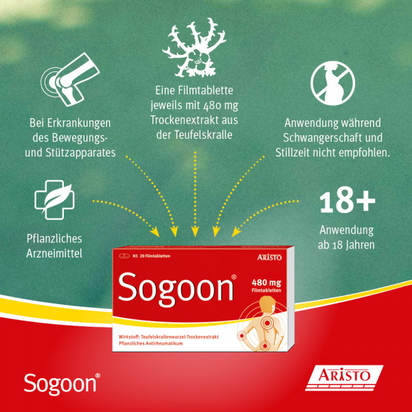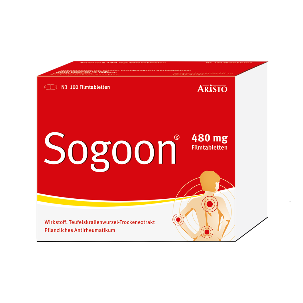 Bei Arzneimittel Sogoon® Filmtabletten handelt es sich um ein pflanzliches Antirheumatikum. Die rezeptfreien Filmtabletten sind zugelassen zur unterstützenden Therapie bei Verschleißerscheinungen des Bewegungsapparates. Sie hemmen Entzündungen und können die Schmerzen bei Gelenkverschleiß lindern. Eine Filmtablette enthält 480 Milligramm Trockenextrakt aus der Teufelskrallenwurzel.