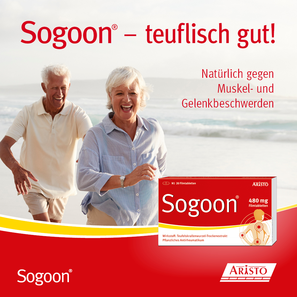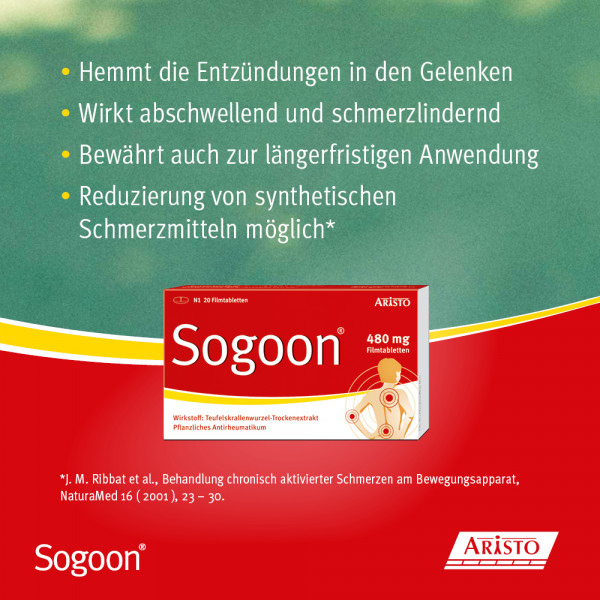 Bei Arzneimittel Sogoon® Filmtabletten handelt es sich um ein pflanzliches Antirheumatikum. Die rezeptfreien Filmtabletten sind zugelassen zur unterstützenden Therapie bei Verschleißerscheinungen des Bewegungsapparates. Sie hemmen Entzündungen und können die Schmerzen bei Gelenkverschleiß lindern. Eine Filmtablette enthält 480 Milligramm Trockenextrakt aus der Teufelskrallenwurzel.