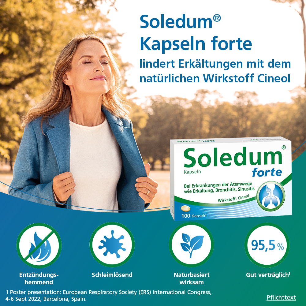 Der naturbasierte Wirkstoff Cineol wirkt schleimlösend und entzündungshemmend. Sinnvoll ist hierbei der Kontakt von Cineol mit dem Wirkort - der angegriffenen Schleimhaut der Atemwege. Dieser Kontakt erfolgt dadurch, dass Cineol nach der Einnahme der Soledum® Kapseln forte auf natürlichem Weg über die Blutbahn auch zur Lunge transportiert wird und dort abgeatmet wird.