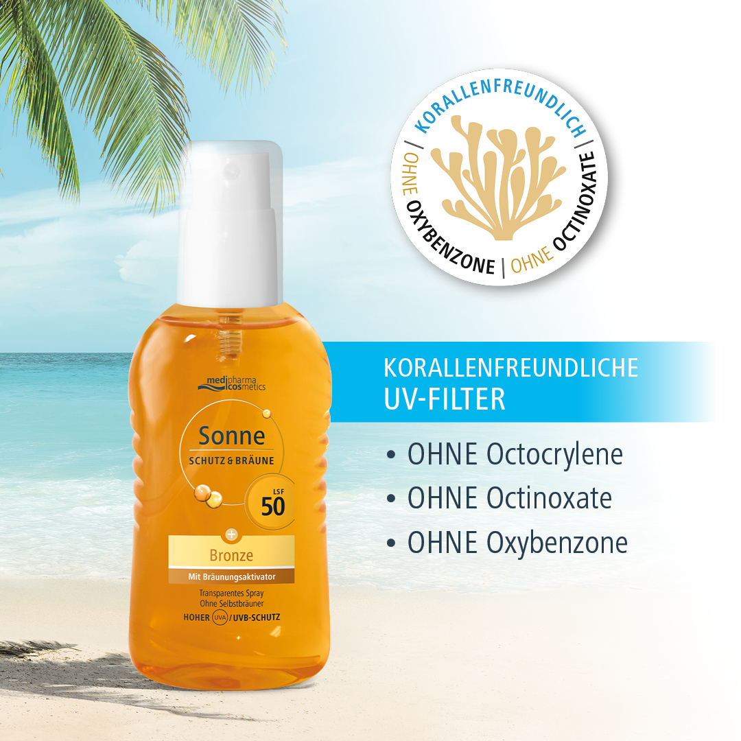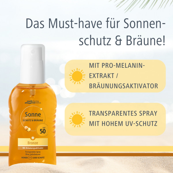 medipharma cosmetics Sonne Schutz & Bräune LSF 50 Pumpspray - Ultraleichtes Sonnenspray für Gesicht und Körper mit Pro-Melanin-Extrakt zur Intensivierung der natürlichen Bräune.