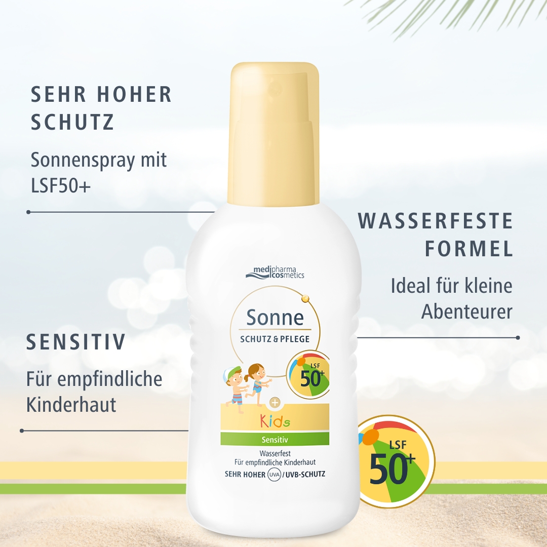 Das wasserfeste Sonnenspray Schutz & Pflege Kids mit LSF 50+ von medipharma cosmetics für empfindliche Kinderhaut ist eine leichte Emulsion mit sehr hohem und zuverlässigem Sonnenschutz. Das Spray ist für Gesicht und Körper geeignet und bietet Sicherheit und Hautschutz auch bei intensiver Sonneneinstrahlung. Das enthaltene Glycerin spendet intensiv Feuchtigkeit und Vitamin E wirkt antioxidativ zur Stärkung der Hautbarriere. Die leichte Textur zieht schnell ein, klebt und fettet nicht und ist wasserfest. Das Spray ist praktisch in der Anwendung und bestens geeignet für unterwegs, da es immer und überall schnell auf die Haut aufgesprüht werden kann.