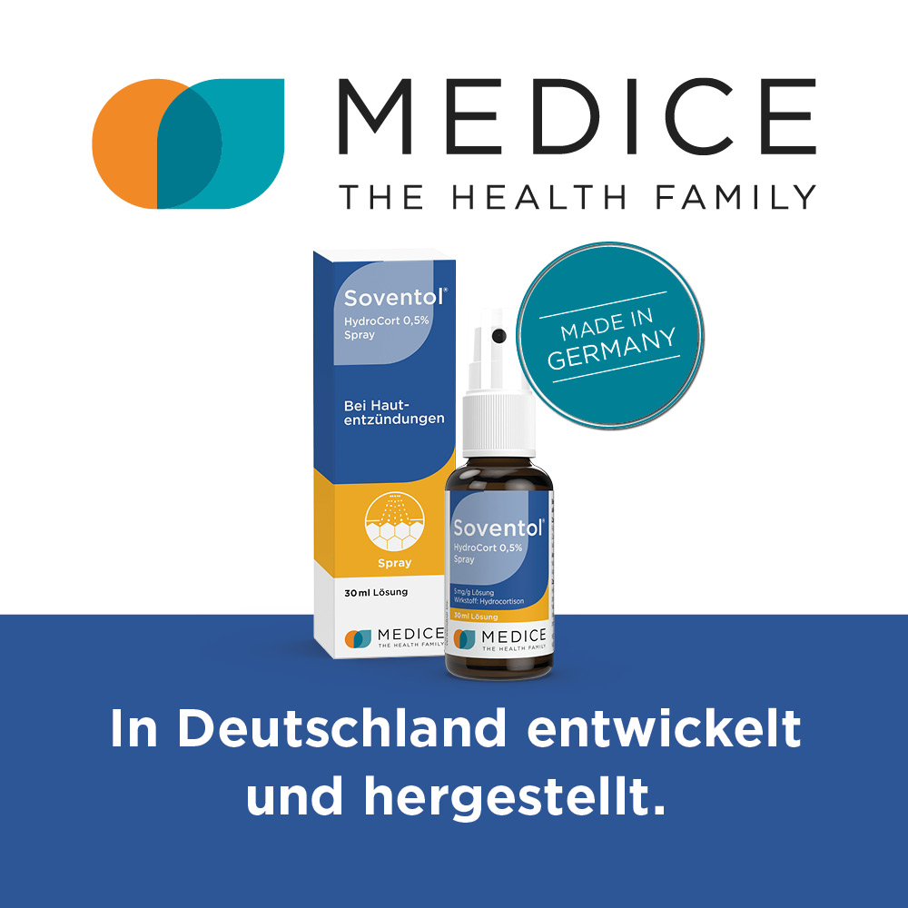 Soventol® HydroCort 0,5% Spray 5 mg/g Lösung. Anwend.: Zur Linder. v. nicht infiz. leichten entzündl., allerg. o. juck. Hauterkr., d. auf eine symptom. Behandl. m. schwach wirks. Glucocorticosteroiden ansprechen. Eignet sich vorzugsweise zur Anwend. auf normaler od. fettiger Haut. Warnhinweis: Enthält Propylenglycol. Zu Risiken und Nebenwirkungen lesen Sie die Packungsbeilage und fragen Sie Ihren Arzt oder Apotheker; 07/2017.