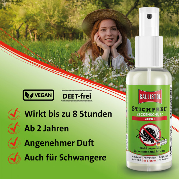 Schützen Sie sich und Ihre Familie vor Zeckenstichen – mit langanhaltendem, hautfreundlichem Schutz! Ballistol Stichfrei Zeckenschutz wurde speziell für Naturfreunde, Outdoor-Sportler, Jäger, Förster und Familien entwickelt. Mit bis zu 8 Stunden Schutz vor Zecken und anderen stechenden Insekten können Sie unbeschwert die Natur genießen – ganz ohne Sorgen um Borreliose oder FSME.