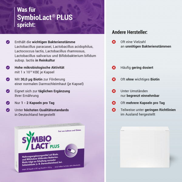 SymbioLact® PLUS enthält sechs verschiedene Stämme natürlicher Darmbakterien aus dem oberen und unteren Verdauungstrakt. Die Bakterien sind gefriergetrocknet und geschützt in der vegetarischen Kapselhülle. Jede Kapsel enthält mindestens 10 Milliarden Bakterienkulturen bzw. 1x1010 koloniebildende Einheiten (KBE) - mehr als die meisten vergleichbaren Produkte.