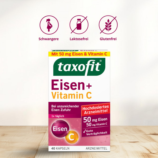 Eisen gehört zu den essenziellen Spurenelementen, die im Körper nur in geringen Mengen vorommen. Wird nicht genügend Eisen zugeführt, können verminderte Leistungsfähigkeit und Ermüdung die Folge sein. Um einem Eisenmangel, bedingt durch unzureichende Eisenzufuhr, vorzubeugen und den Körpereigenen Eisenstatus zu stabilisieren, gibt es taxofit® Eisen + Vitamin C - mit der sinnvollen Kombination von Eisen und Vitamin C bekommt der Körper genau die Stärkung, die er benötit, wenn zu wenig Eisen aufgenommen wurde. Das gut bioverfügbare Eisen II kann im Gegensatz zu Eisen aus der Nahrung direkt in den Eisenstoffwechsel eingeschleust werden. Die Zugabe von Vitamin C begünstigt die Aufname von Eisen in dem Organismus.