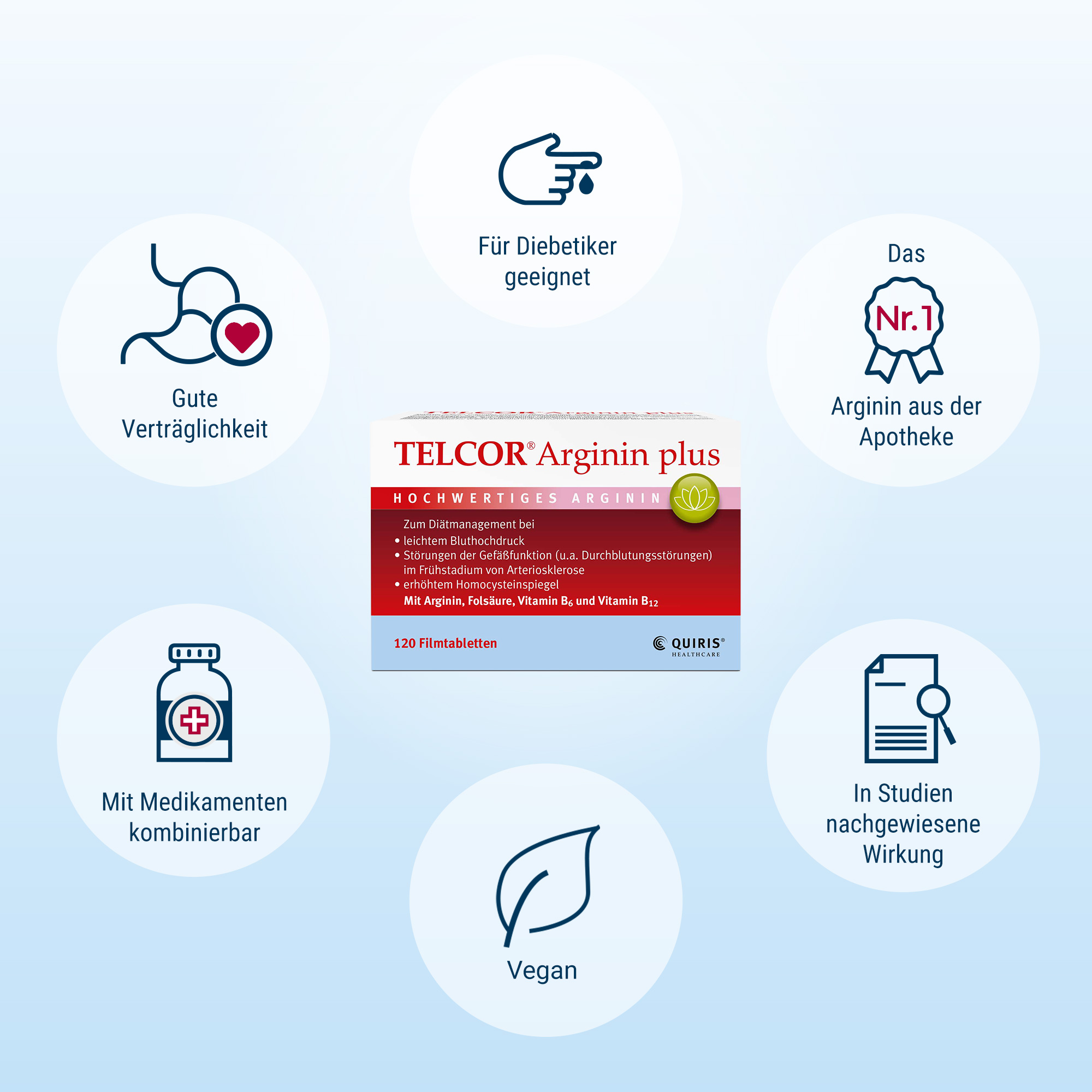 Zur diätetischen Behandlung von: leichtem Bluthochdruck Störungen der Gefäßfunktion (u. a. Durchblutungsstörungen) im Frühstadium von Arteriosklerose erhöhtem HomocysteinspiegelAufgrund der sehr guten Verträglichkeit kann Telcor® Arginin plus zusammen mit anderen Medikamenten, wie z. B. vom Arzt verordneten Blutdrucksenkern, eingenommen werden und ist für eine Langzeitanwendung geeignet. Die Anwendung ersetzt nicht die vom Arzt verordneten Medikamente.Für Diabetiker empfohlen! Mit Telcor® Arginin plus werden dem Körper sinnvoll abgestimmte Mengen an Arginin und B-Vitaminen zugeführt, die positive Effekte auf die Gefäß- und Herzgesundheit haben. Unser Körper bildet aus Arginin, in speziellen Zellen der Gefäßinnenwand, den wichtigen Botenstoff Stickstoffmonoxid (NO). Dieser natürliche Botenstoff entspannt die Blutgefäße, unterstützt damit die körpereigene Blutdruckregulation und verbessert die Elastizität der Blutgefäße. So wird das Herz auf natürliche und physiologische Weise entlastet und unterstützt. Als Radikalfänger kann das aus Arginin gebildete NO zudem entzündlichen Prozessen in den Gefäßen entgegenwirken und die Durchblutung mit einer ausreichenden Nährstoff- und Sauerstoffversorgung im gesamten Organismus unterstützen.In Telcor® Arginin plus wird ausschließlich besonders hochgereinigtes Arginin der Premiumqualität PROArgin® mit natürlichem Ursprung eingesetzt. Mit einer speziell entwickelten dreifachen Umkristallisation wird höchste Arginin-Reinheit gewährleistet. Diese einzigartige PROArgin®-Qualität gewährleistet in Telcor® Arginin plus die höchsten Sicherheits- und Qualitätsstandards.Das Arginin wird durch eine Fermentation (Bioreaktion) aus pflanzlichen Rohstoffen und damit auf rein natürliche Weise gewonnen. Es entspricht vollständig dem natürlichen Arginin, welches in geringen Mengen auch in vielen Lebensmitteln wie Gemüse, Fleisch und Nüssen vorkommt. Mit der gleichzeitigen Einnahme von B-Vitaminen, insbesondere der Folsäure, werden die ernährungsmedizinischen Effekte von Arginin durch Steigerung der NO-Bildung gefördert. Umso wichtiger ist es, Arginin zusammen mit diesen B-Vitaminen einzunehmen, z. B. mit Telcor® Arginin plus, da diese einzigartige synergistische Nährstoffkombination mehr bewirken kann als die Einnahme der einzelnen Stoffe. Gleichzeitig unterstützen die B-Vitamine den Abbau von unerwünschtem Homocystein und verringern damit den oxidativen Stress.Da gerade für Bluthochdruckpatienten ein möglichst niedriger Homocysteinspiegel wichtig ist, sollte auf eine ausreichende Zufuhr dieser Vitamine geachtet werden. Folsäure, Vitamin B6 und B12 sind vornehmlich in Blattgemüse, aber auch in Vollkornprodukten enthalten.