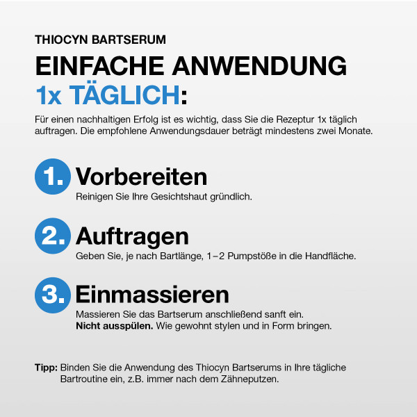 - Tipp: Binden Sie die Anwendung des Thiocyn Bartserums in Ihre tägliche Bartroutine ein, z.B. immer nach dem Zähneputzen.