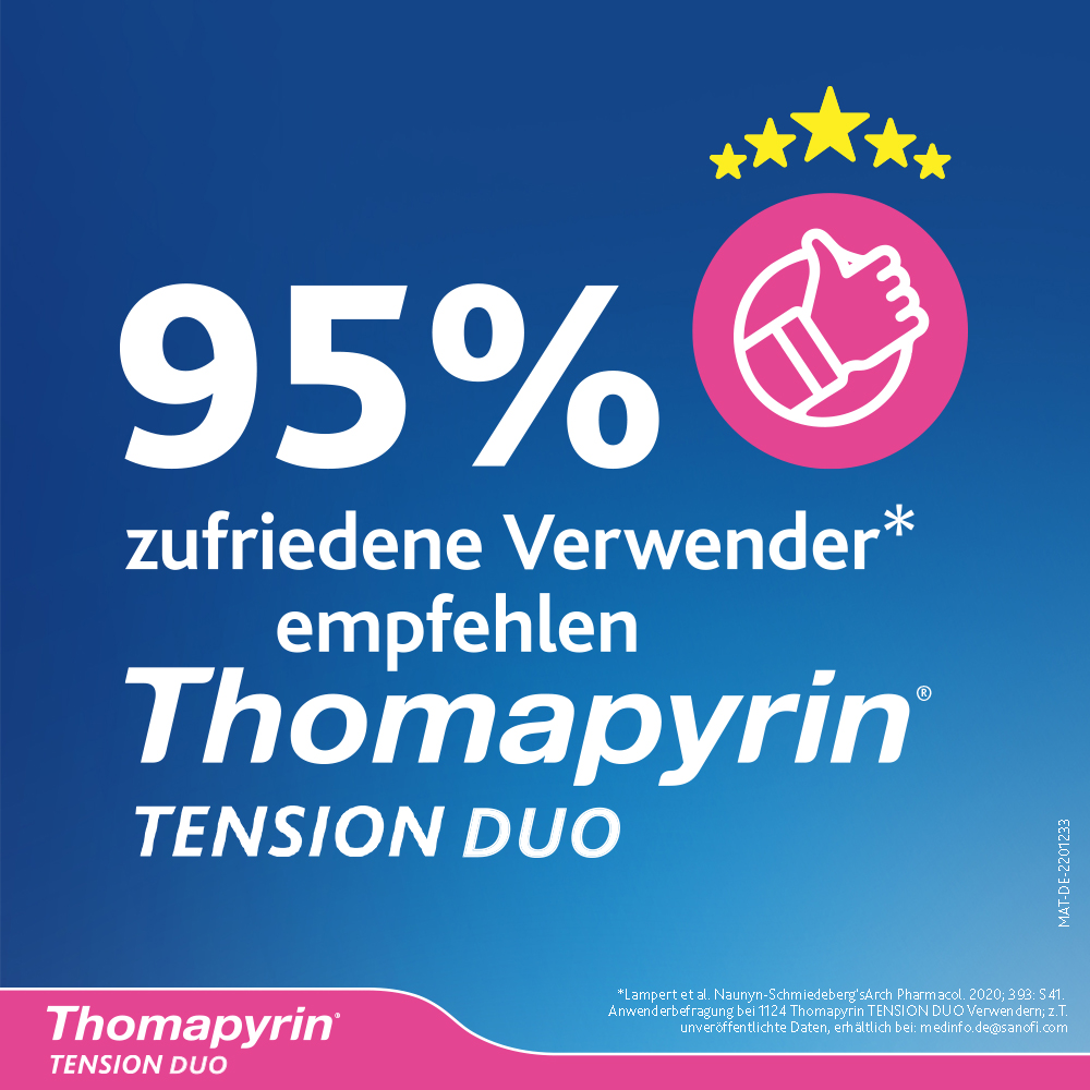 Thomapyrin TENSION DUO ist nur für Erwachsene angezeigt. Wenn Sie sich nach 3 Tagen nicht besser oder gar schlechter fühlen, müssen Sie sich an Ihren Arzt wenden.