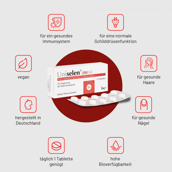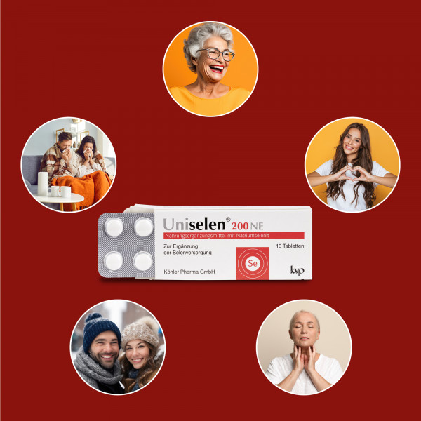 Selen ist ein für die menschliche Gesundheit unentbehrliches Spurenelement, das der Organismus jedoch nicht selbst bilden kann. Die biologische Hauptfunktion von Selen besteht, als Bestandteil körpereigener Enzyme, im Zellschutz. In diesem Zusammenhang ist das bedeutenoste selenhaltige Schutzenzym die Glutathionperoxidase, die den Auswirkungen der Freien Radikalen entgegenwirkt. Freie Radikale (=aggressive Teilchen, die Körperzellen chemisch verändern) entstehen, wenn der Organismus belastenden Umwelteinflüssen, wie z. B. erhöhter UV-Strahlung und Abgasen sowie starken körperlichen Beanspruchungen ausgesetzt ist. Die Europäische Behörde für Lebensmittelsicherheit (EFSA) hat die Bedeutung von Selen für ein gut funktionierendes Immunsystem und eine gesunde Schilddrüsenfunktion anerkannt. Ebenso den hohen Stellenwert von Selen für den antioxidativen Schutz der Zellbestandteile sowie der Reifung der Samenzellen. ln Deutschland sind nicht selten Ernährungssituationen anzutreffen, unter denen eine ausreichende Selenversorgung nicht gewährleistet ist. Gründe dafür können eine unausgewogene Ernährung sein oder der Umstand, dass unsere Nahrungsmittel zum Teil selenarm sind (ausgelaugte Ackerböden) oder dass in bestimmten Belastungssituationen (wie z.B. Stress der Selenbedarf des Körpers erhöht ist. Uniselen 100 NE enthält das Spurenelement Selen in Form von Natriumselenit. Aus dieser Verbindung kann das Selen besonders schnell in selenhaltige Enzyme eingebaut und für den Körper verfügbar gemacht werden.
