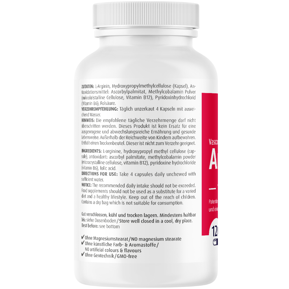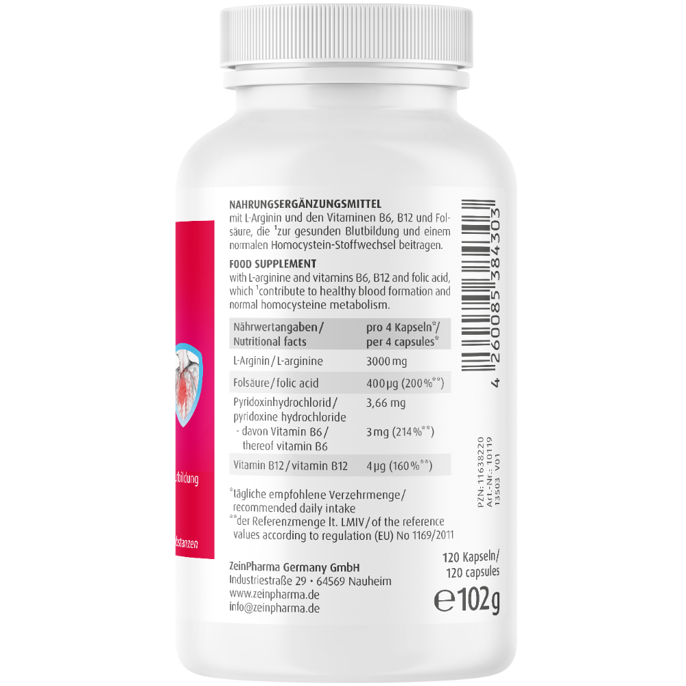 L-Arginin, Hydroxypropylmethylcellulose (Kapsel), Antioxidationsmittel: Ascorbylpalmitat, Methylcobalamin Pulver (mikrokristalline Cellulose, Vitamin B12), Pyridoxinhydrochlorid (Vitamin B6), Folsäure.