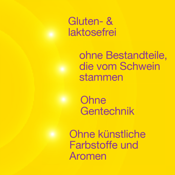 Mittelkettige Triglyceride (aus Kokosnuss- und Palmöl), Rindergelatine, Festigungsmittel: Glycerin, Antioxidationsmittel: Alpha-Tocopherol, Cholecalciferol (Vitamin D3)