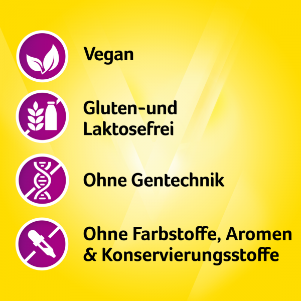 Die empfohlene tägliche Verzehrsmenge nicht überschreiten. Nahrungsergänzungsmittel sind kein Ersatz für eine ausgewogene, abwechslungsreiche Ernährung und eine gesunde Lebensweise.