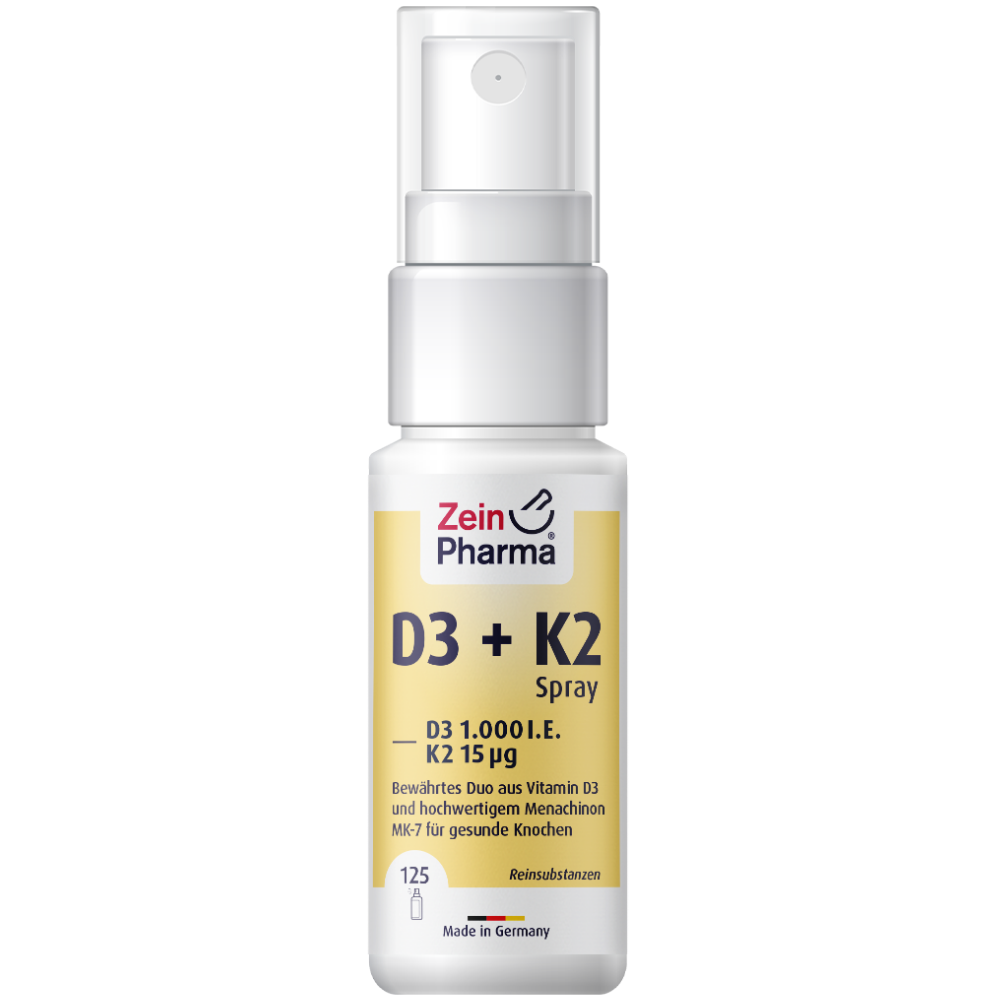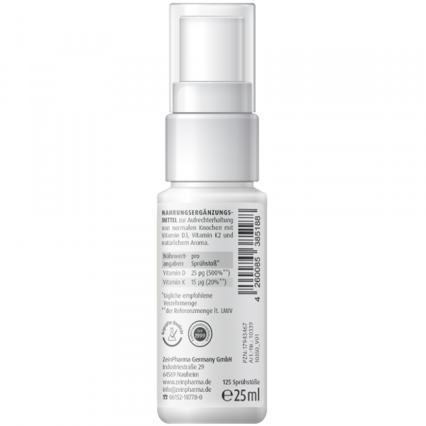 • Optimal dosiert: In nur einem Sprühstoß sind 1000 I.E. Vitamin D3 und 15 μg Vitamin K2 zur Deckung des Tagesbedarfs enthalten