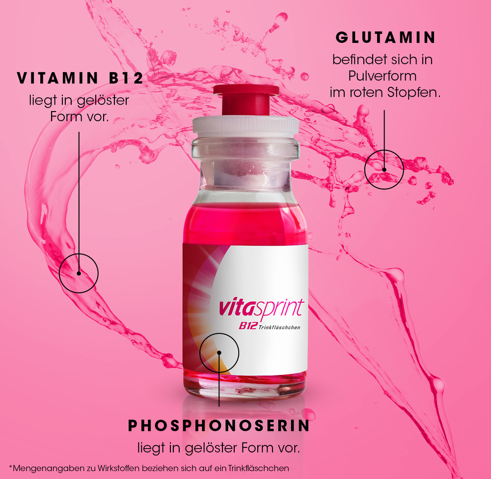 Vitasprint B12 Trinkfläschchen Wirkstoff: Cyanocobalamin (Vitamin B12), (RS)-2-Amino-3-(phosphonooxy)propansäure (DL-Phosphonoserin), Glutamin. Anwendungsgebiete: Traditionell angewendet zur Besserung des Allgemeinbefindens. Warnhinweis: Enthält Sorbitol. Freiverkäuflich. Stand: 12/2020. Zu Risiken und Nebenwirkungen lesen Sie die Packungsbeilage und fragen Sie Ihren Arzt oder Apotheker.