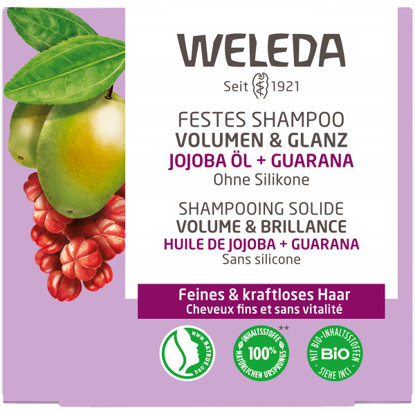 Weleda Festes Shampoo Volumen & Glanz Feste Naturkosmetik Haarpflege für kraftvolles Haar, das natürlich glänzt, für feines und kraftloses Haar, ohne Silikone • Verleiht dem Haar Volumen und erhält den natürlichen Glanz • Reinigt sanft, ohne zu beschweren • Das Haar ist leicht kämmbar Beschreibung Die einzigartige Formel mit hochwertigen Inhaltsstoffen natürlichen Ursprungs wie Bio-Jojoba Öl, Bio-Reispotein und Guarana Extrakt verleiht deinem Haar Volumen und Glanz und pflegt gleichzeitig deine Kopfhaut. Die silikonfreie und milde Formulierung ist 100% natürlichen Ursprungs, Natrue-zertifiziert und sanft zu Haar und Kopfhaut. Hautverträglichkeit dermatologisch getestet. Fruchtig-frischer Duft. Verwöhne während der Haarpflege deine Sinne: die frischen Noten der Bergamotte verbinden sich mit aromatischem Lavendel und werden abgerundet durch leicht holzige Nuancen von Zedernholz. Tipp Der zarte Schaum lässt sich gut verteilen und auswaschen. Das feste Shampoo macht das Haar leicht kämmbar, geschmeidig und beschwert es nicht. Anwendung Festes Shampoo direkt im feuchten Haar oder zwischen nassen Händen aufschäumen (Augenpartie aussparen). Verteilen und einmassieren. Gut ausspülen. Das Feste Shampoo nach Gebrauch trocknen lassen und trocken aufbewahren.