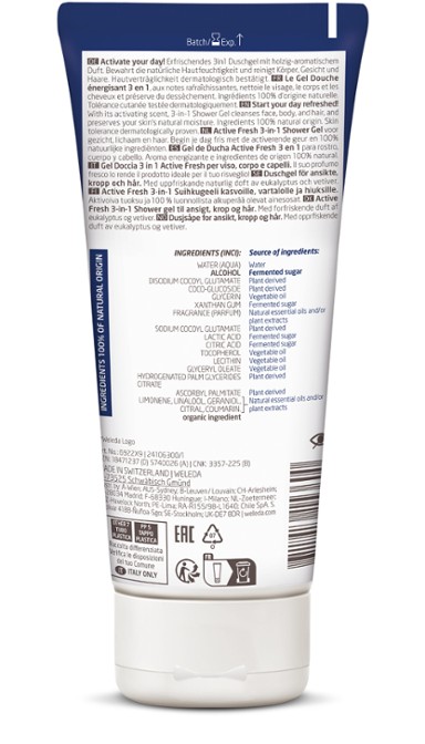 Weleda For Men Active Fresh 3in1 Shower Gel Naturkosmetik Männer 3in1 Duschgel reinigt Körper, Gesicht & Haare, mit erfrischend-herbem & maskulinem Duft • Holzig-aromatischer Duft • Reinigt Körper, Gesicht und Haare • Entfernt Körpergerüche gründlich • Erfrischende Gel-Textur • 100 % natürlicher Duft • Lässt sich gut abspülen Beschreibung Holzig-aromatischer Duft mit Eukalyptus und Vetiver Beginnen Sie Ihren Tag erfrischt! Dieses Duschgel ist der ideale Begleiter beim Aufwachen. Ätherisches Öl aus Eukalyptus entfaltet einen aktivierenden und erfrischenden Duft. Holzige Noten aus Vetiver runden das Dufterlebnis harmonisch ab und setzen warme und maskuline Akzente. Duft mit 100 % natürlichen ätherischen Ölen. 3in1: reinigt Körper, Gesicht und Haare Das 3in1-Duschgel reinigt Körper, Gesicht und Haare in einem Schritt, entfernt Körpergerüche gründlich und bewahrt die natürliche Feuchtigkeit Ihrer Haut. Fühlen Sie sich natürlich wohl! Unsere gut abspülbare Formel enthält Inhaltsstoffe 100 % natürlichen Ursprungs und reinigt mit milden, pflanzlichen Tensiden. Hautverträglichkeit dermatologisch bestätigt. Anwendung Duschgel auf die nasse Haut und das Haar auftragen und auf dem ganzen Körper verteilen. Augenpartie aussparen. Mit Wasser abspülen. Nach der Dusche können Sie Ihre Haut mit Weleda Körperlotionen oder Körperölen pflegen.