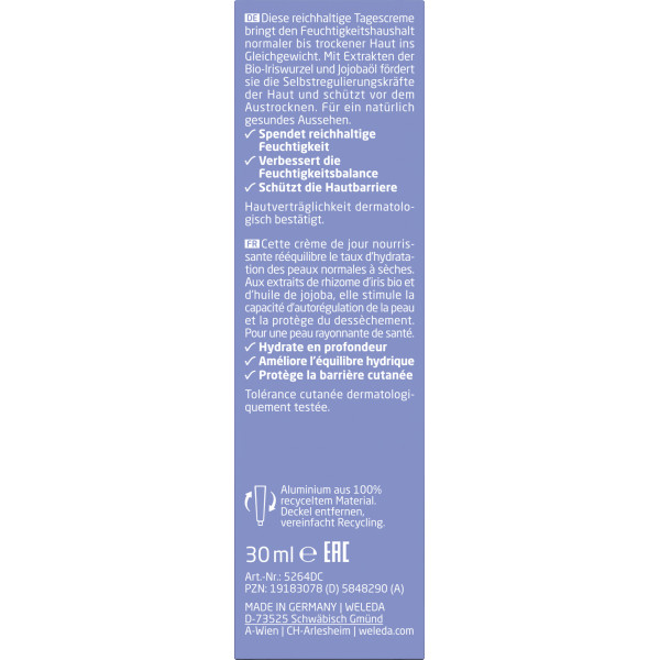 Morgens nach der Reinigung auf Gesicht, Hals und Dekolleté auftragen. Eignet sich auch sehr gut als Make-up Grundlage. Falls die Pflege zu reichhaltig wirkt, teste unsere Iris Feuchtigkeitscreme.