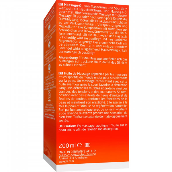 Zur Massage auf die Handfläche geben und damit, je nach Körperteil, sanfte bis kräftige Streich-, Klopf-, Knet- oder Vibrationsbewegungen ausführen. Zur täglichen Hautpflege nach Dusche oder Bad sparsam in die noch leicht feuchte Haut einreiben, so lässt sich das Öl gut verteilen und zieht rasch ein, ohne einen Fettfilm zu hinterlassen. Verschluss sauber halten.