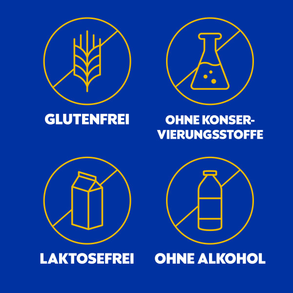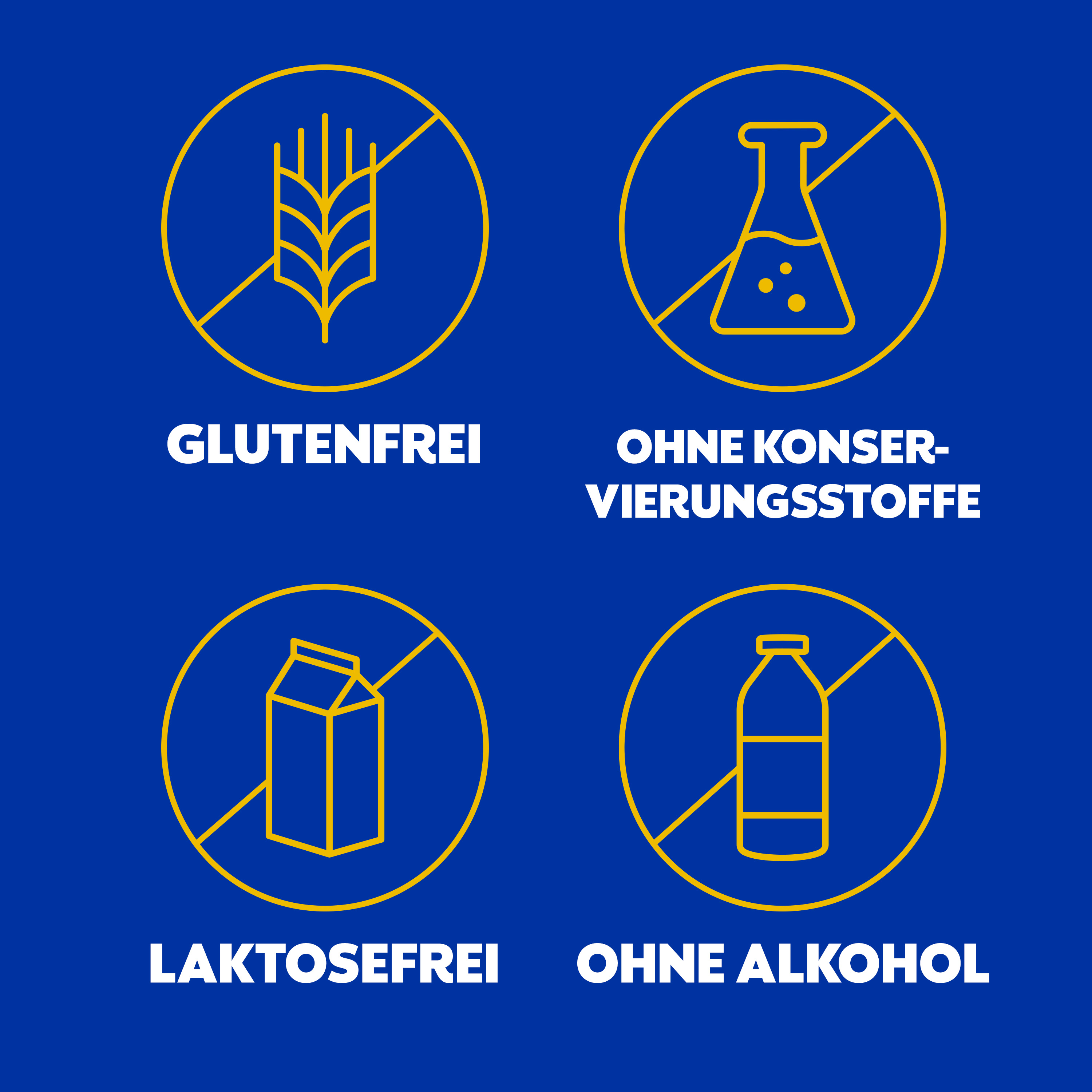 GEEIGNET BEI BESTIMMTEN UNVERTRÄGLICHKEITEN: Glutenfrei, laktosefrei, ohne Alkohol und ohne Konservierungsstoffe.