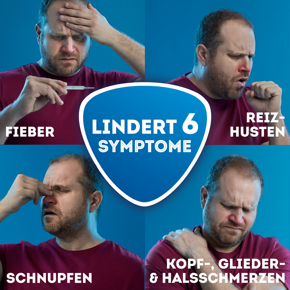 - Effektive Linderung von 6 Symptomen einer Erkältung: Kopfschmerzen, Gliederschmerzen, Halsschmerzen, Fieber, Schnupfen und Reizhusten