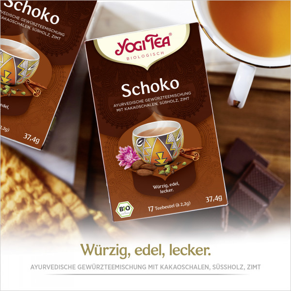 Die Azteken wussten um die Bedeutung von Gewürzen für die Schokoladenzubereitung. Für die Zubereitung von \"Xocoatl\", ihrem ehrwürdigen \"Getränk der Götter\" mischten sie Kakao mit Gewürzen wie Vanille, südamerikanischem Zimt und Chili. In dieser Tradition haben wir unseren YOGI TEA Schoko entwickelt. Er ist ein echter Insider-Tipp, fast ein Kultobjekt für die, die ihn kennen und lieben gelernt haben: Schoki's best drink. Wir benutzen für das Rezept Kakaoschalen mit vollem Geschmack, aber nur einem verschwindend geringen Gehalt an Theobromin, dem 'Kakao-Koffein'. In Zusammenarbeit mit der Gepa werden sie nach den Kriterien des Fairen Handels produziert. Zusätzlich kommen alle wunderbaren YOGI TEA-Gewürze dazu. Kein Wunder, YOGI TEA Schoko ist bei Kindern beliebt, und bei allen anderen Schleckermäulern ebenso.