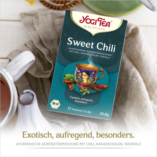 YOGI TEA Sweet Chili schenkt gute Laune und weckt unsere Lebensgeister. Seine leicht verführerische Schärfe, gepaart mit anregenden Gewürzen, lässt die Seele singen und die Beine tanzen. YOGI TEA Sweet Chili kombiniert, wie auf mexikanische Art zubereitete Schokolade, die Kakaoschalen mit aromatischen Gewürzen, streichelt unsere Sinne, ist eine milde Verführung. Dieser Tee macht Lust auf Leben und bringt positive Energie. YOGI TEA Sweet Chili ist eine Köstlichkeit mit Schätzen aus der Alten und der Neuen Welt. Gewürze aus dem Orient und feuriger Chili aus dem mittleren Amerika verbinden sich, unseren Lebensalltag zu verzaubern. YOGI TEA Sweet Chili schmeckt zu jeder Tages- und Nachtzeit, mit und ohne Milch.