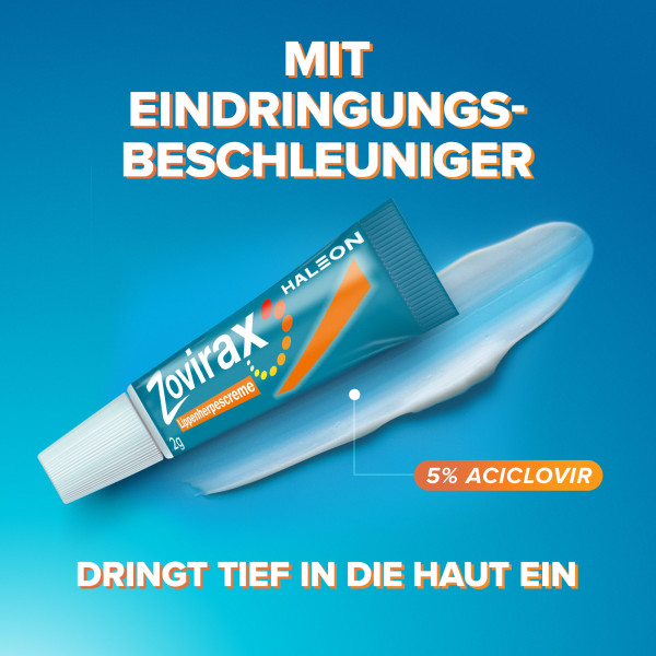 Zovirax Lippenherpescreme – Schnelle Behandlung von Lippenherpes. Zovirax Lippenherpescreme bekämpft die Virenvermehrung und verkürzt die Schmerz- und Heilungsdauer. Wirkt ab dem ersten Kribbeln und in der Bläschenphase. Bei Lippenherpes ist Schnelligkeit gefragt: Zovirax Lippenherpescreme verkürzt die Schmerz- und Heilungsdauer. Klinisch geprüfte antivirale Behandlung: Der Wirkstoff Aciclovir hebt sich dadurch hervor, dass er in den befallenen Zellen aktiv wird und dort die Virusvermehrung stoppt. Der Wirkbeschleuniger sorgt für das schnelle konzentrierte Eindringen des Wirkstoffes in die tieferen Hautschichten. Zovirax Lippenherpescreme ist einfach aufzutragen und zieht schnell ein: Die weiße Creme wird beim vorsichtigen Einreiben innerhalb von 40 Sekunden farblos. Anwendungsgebiet: Zur lindernden Therapie von Schmerzen und Juckreiz sowie zur Beschleunigung der Krustenbildung beim natürlichen Heilungsverlauf von akuten Episoden wiederholt auftretender Lippenbläschen (rezidivierender Herpes labialis). Art der Anwendung: Für größtmöglichen Behandlungserfolg vor und während der Bläschenphase anwenden. Falls nicht anders verordnet, 5 x täglich dünn auf die betroffenen und die angrenzenden Hautbereiche auftragen. Hände vor und nach dem Auftragen gründlich waschen. Bei den ersten Anzeichen der Herpeserkrankung (Kribbeln, Brennen) anwenden. Im Allgemeinen beträgt die Anwendungsdauer 4 Tage. Für wen geeignet? Es gibt keine Altersbeschränkung für die Anwendung von Zovirax Lippenherpescreme. Hinweis: Sind nach spätestens 10 Tagen die Bläschen nicht verkrustet oder abgeheilt, suchen Sie bitte einen Arzt auf.